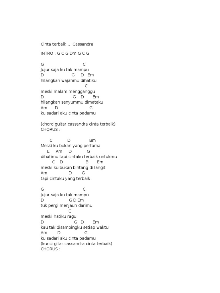 G C G Dm G C G G C Jujur saja ku tak mampu D G D Em hilangkan wajahmu dihatiku C meski malam mengganggu D G D Em hilangkan senyummu dimataku Am D G ku sadari aku cinta padamu C D Bm. There is no strumming pattern for this song yet. Cassandra - Cinta Terbaik Chord Gitar dan Lirik Lagu.